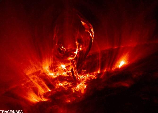 نرى في هذه الصورة كوكب الأرض على اليمين ويحيط به مجال مغنطيسي قوي جداً وهذا المجال كما نرى يصد الجسيمات التي تطلقها الشمس وتسمى الرياح الشمسية القاتلة، ولولا وجود هذا المجال لاختفت الحياة على ظهر الأرض، ولذلك قال تعالى: (وَجَعَلْنَا السَّمَاءَ سَقْفًا مَحْفُوظًا وَهُمْ عَنْ آَيَاتِهَا مُعْرِضُونَ) [الأنبياء: 32].